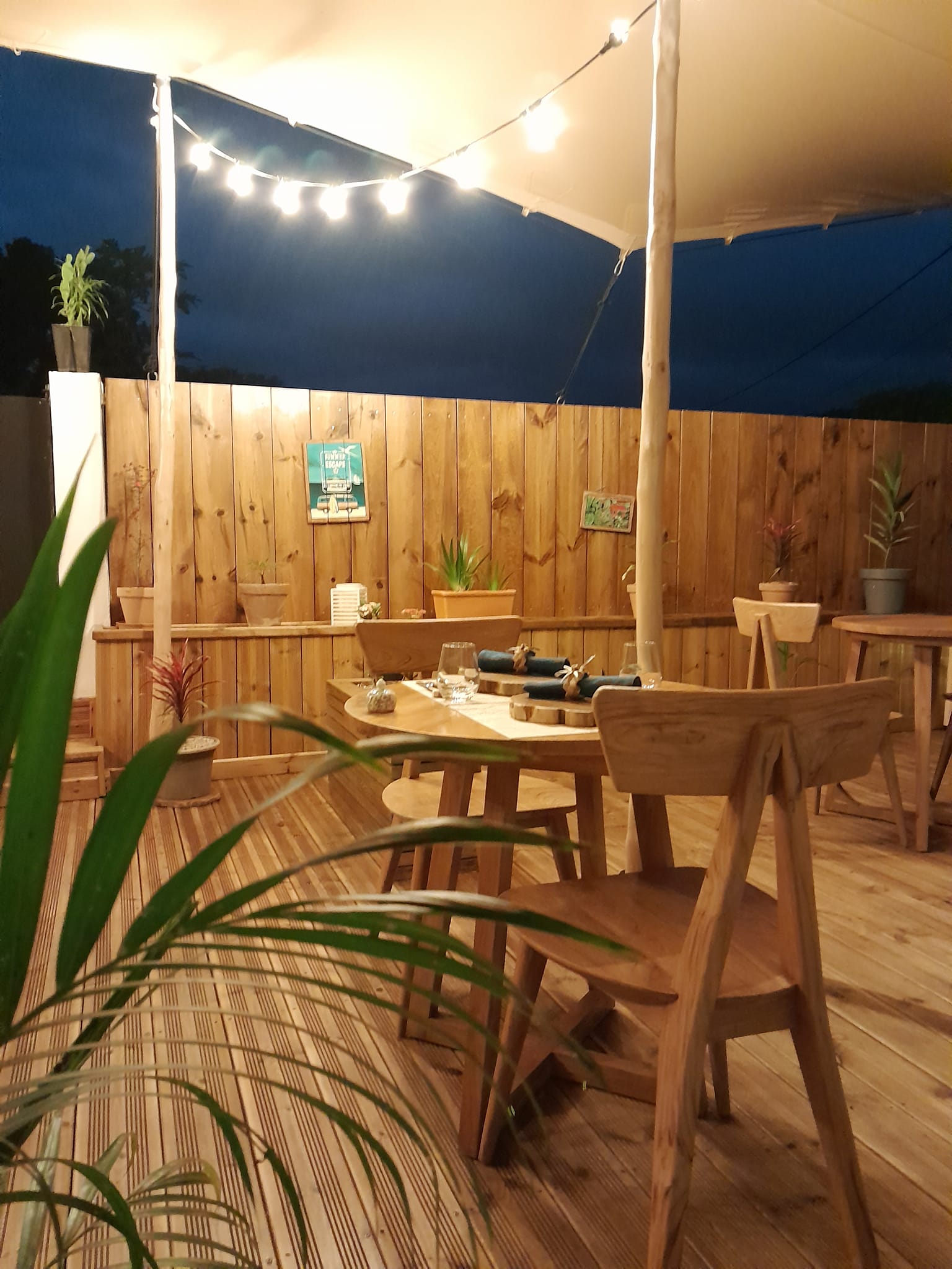 À la tombée du jour, lorsque l’air devient plus doux sur la côte Est de Saint-André, une lumière chaleureuse s’allume sous une terrasse en bois. Des guirlandes scintillent doucement, le parfum du bois chauffé se mêle à celui des herbes fraîches… Bienvenue au restaurant Bal La Poussière, une adresse où l’on vient autant pour l’assiette que pour l’atmosphère.